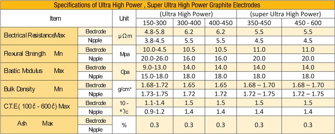 The main information related to two different grades of graphite electrodes supplied by this company can be seen in the table by mentioning the size.